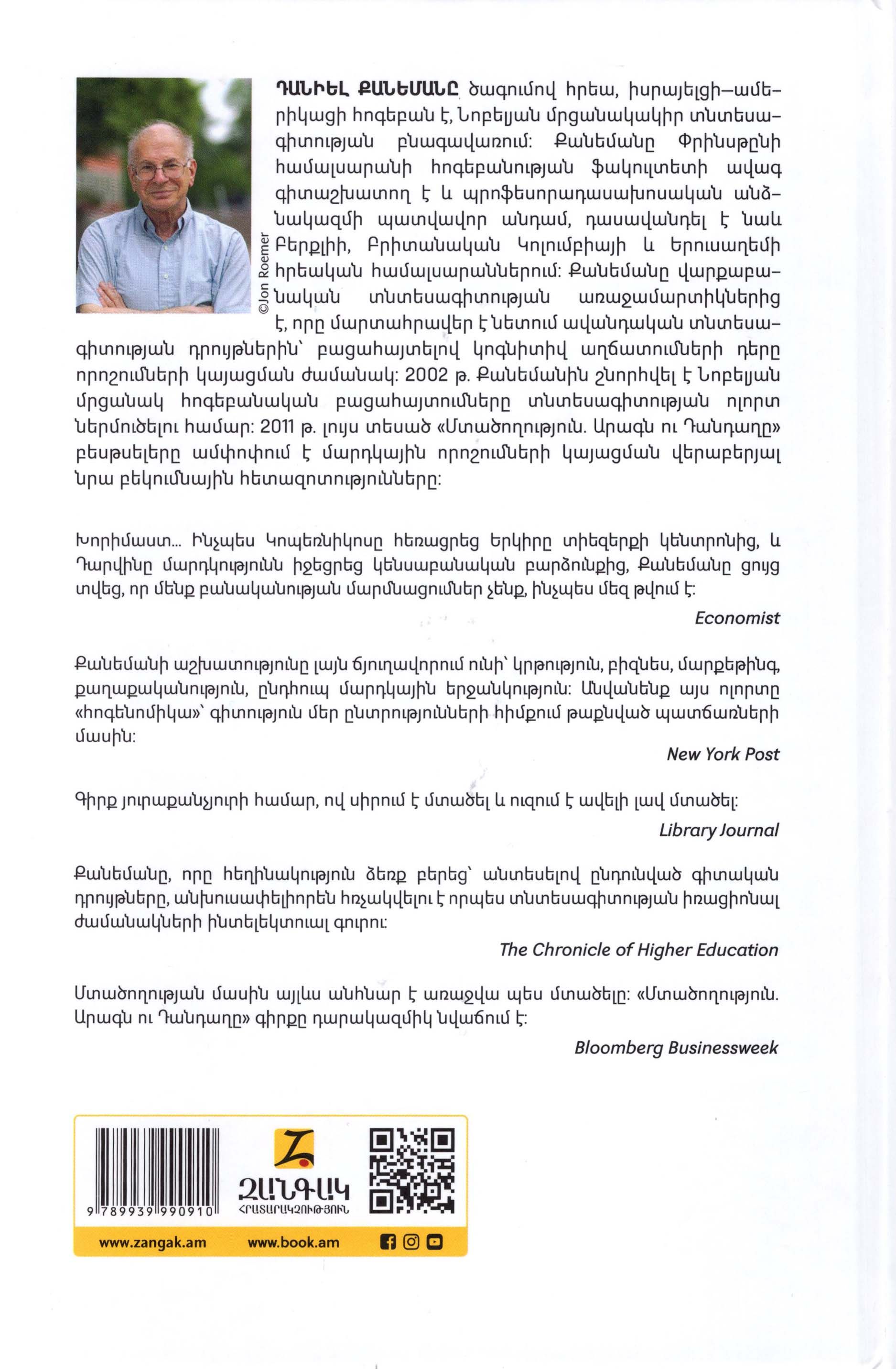 Դանիել Քանեմանը ծագումով հրեա, իսրայելցի-ամերիկացի հոգեբան էր, Նոբելյան մրցանակակիր տնտեսագիտության բնագավառում: Քանեմանը Փրինսթընի համալսարանի հոգեբանության ֆակուլտետի ավագ գիտաշխատող էր և պրոֆեսորադասախոսական անձնակազմի պատվավոր անդամ, դասավանդել է նաև Բերքլիի, Բրիտանական Կոլումբիայի և Երուսաղեմի հրեական համալսարաններում։ Քանեմանը վարքաբանական տնտեսագիտության առաջամարտիկներից էր, որը մարտահրավեր էր նետում ավանդական տնտեսագիտության դրույթներին՝ բացահայտելով կոգնիտիվ աղճատումների դերը որոշումների կայացման ժամանակ։ 2002 թ. Քանեմանին շնորհվել է Նոբելյան մրցանակ հոգեբանական բացահայտումները տնտեսագիտության ոլորտ ներմուծելու համար։ 2011թ. լույս տեսած «Մտածողություն. Արագն ու Դանդաղը» բեսթսելերը ամփոփում է մարդկային որոշումների կայացման վերաբերյալ նրա բեկումնային հետազոտությունները։