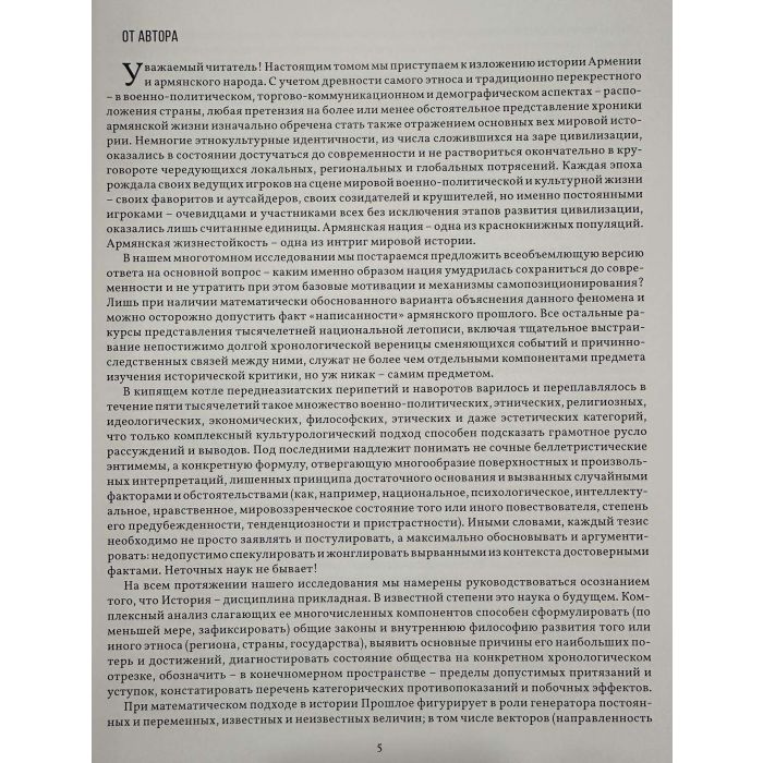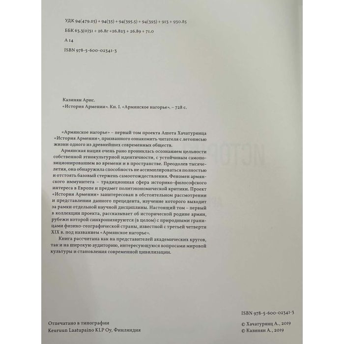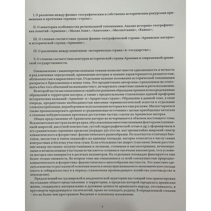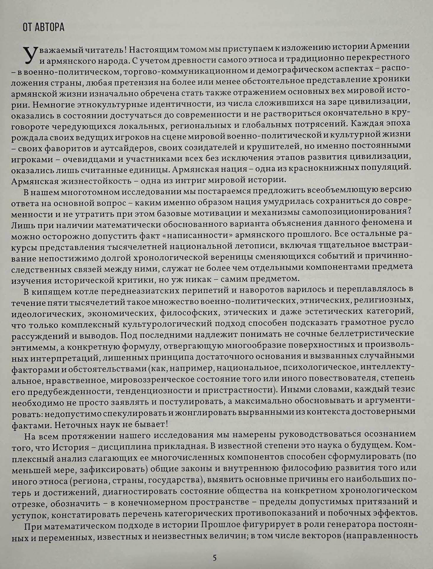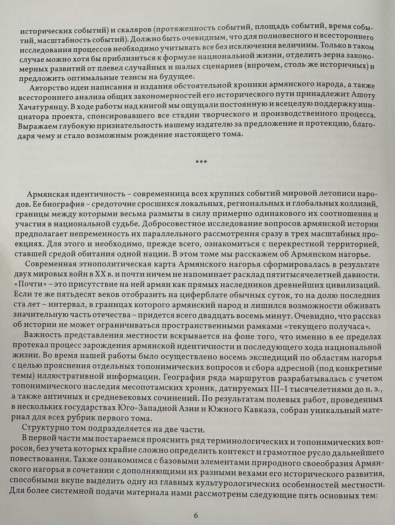 Армянская нация очень рано прониклась осознанием цельности собственной этнокультурной идентичности, с устойчивым самопозиционированием во времени и в пространстве. Преодолев тысячелетия, она обнаружила способность не ассимилироваться полностью и отстоять базовый стержень самоотождествления. Феномен армянского иммунитета-традиционная сфера историко-философского интереса в Европе и предмет политэкономической критики. Проект «История Армении» заинтересован в обстоятельном рассмотрении и представлении данного прецедента, изучение которого выходит за рамки отдельной научный дисциплины. Настоящий том- первый в коллекции проекта, рассказывает об исторической родине армян, рубежи кототрой синхронизируются ( в целом) с природными границами физико-географической страны, известной с третьей четверти ХIX в. под названием «Армянское нагорье».