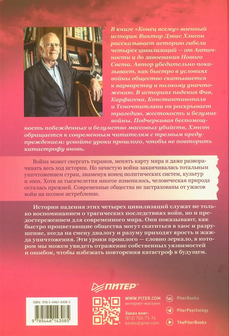 Война может свергать тиранов, менять карту мира и даже разворачивать весь ход истории. Но, зачастую, война заканчивалась тотальным уничтожением стран, знаменуя конец политических систем, культур и эпох. Хотя за тысячелетия многое изменилось, человеческая природа осталась прежней. Современные общества не застрахованы от ужасов войн на полное истребление. В книге «Конец всему» военный историк Виктор Дэвис Хэнсон рассказывает историю гибели четырех цивилизаций: от античности и до завоевания Нового Света. Автор убедительно показывает, как быстро в условиях войны общество скатывается к варварству и полному уничтожению. В историях падения Фив, Карфагена, Константинополя и Теночтитлана он раскрывает трагедию, жестокость и безумие войны. Подчеркивая беспомощность побежденных и безумство массовых убийств, Хэнсон обращается к современным читателям с трезвым предупреждением: усвойте уроки прошлого, чтобы не повторить катастрофу вновь. Истории падения этих четырех цивилизаций служат не только воспоминанием о трагических последствиях войн, но и предостережением для современного мира. Они показывают, как быстро процветающие общества могут скатиться в хаос и разрушение, когда на смену диалогу и разуму приходят ярость и жажда уничтожения. Эти уроки прошлого — словно зеркало, в котором мы можем увидеть отражение собственных уязвимостей и ошибок, чтобы избежать повторения катастроф в будущем.