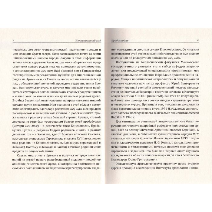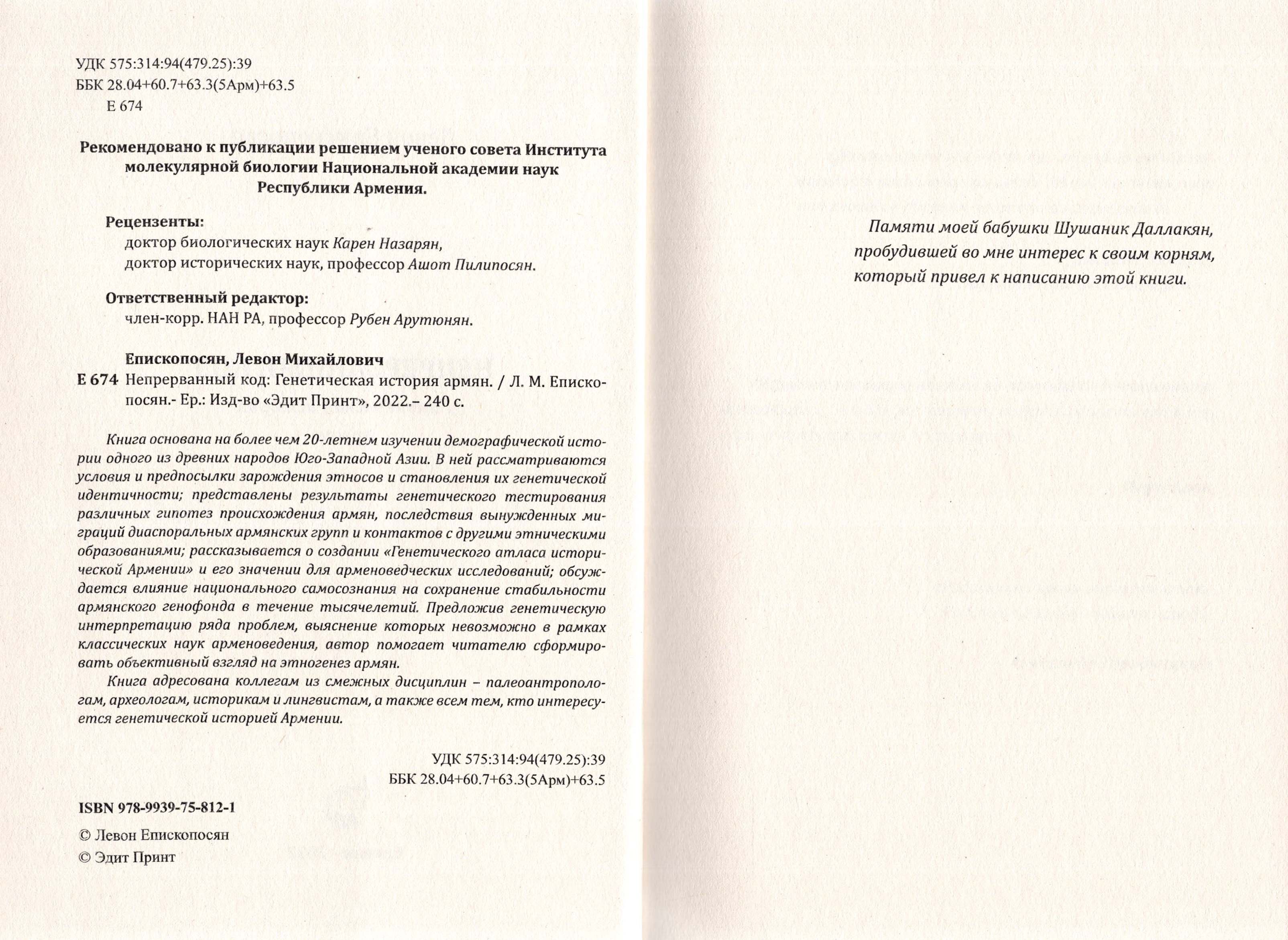 Книга основана на более чем 20-летнем изучении демографической истории одного из древних народов Юго-Западной Азии. В ней рассматриваются условия и предпосылки зарождения этносов и становления их генетической идентичности ; представлены результаты генетического тестирования различных гипотез происхождения армян, последствия вынужденных миграций диаспоральных армянских групп и контактов с другими этническими образованиями; рассказывается о создании «Генетического атласа исторической Армении» и его занчении для арменоведческих исследований; обсуждается влияние национального самосознания на сохранение стабильности армянского генофонда в течение тысячелетий. Предложив генетическую интерпретацию ряда проблем, выяснение которых невозможно в рамках классических наук арменоведения, автор помогает читателю сформировать обЪективный взгляд на этногенез армян. Книга адресована коллегам из смежных дисциплин- палеоантропологам, археологам, историкам и лингвистам, а также всем тем, кто интересуется генетической историей Армении.