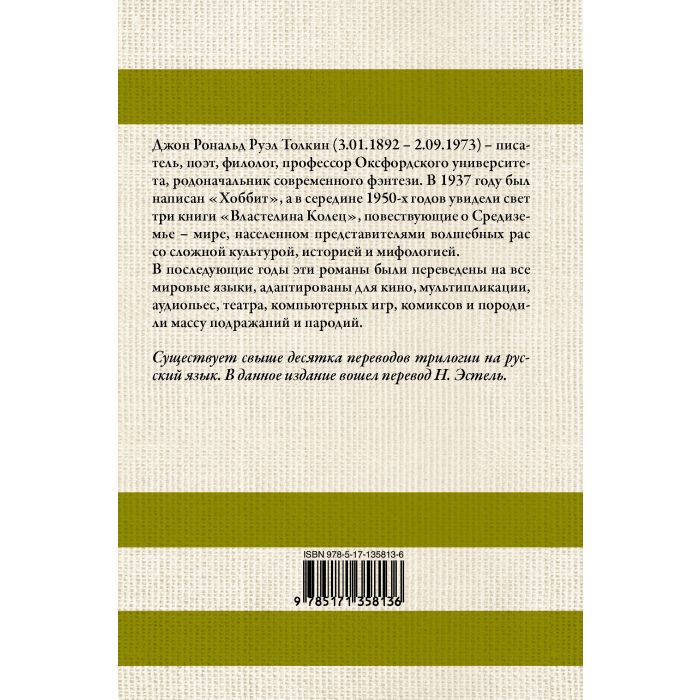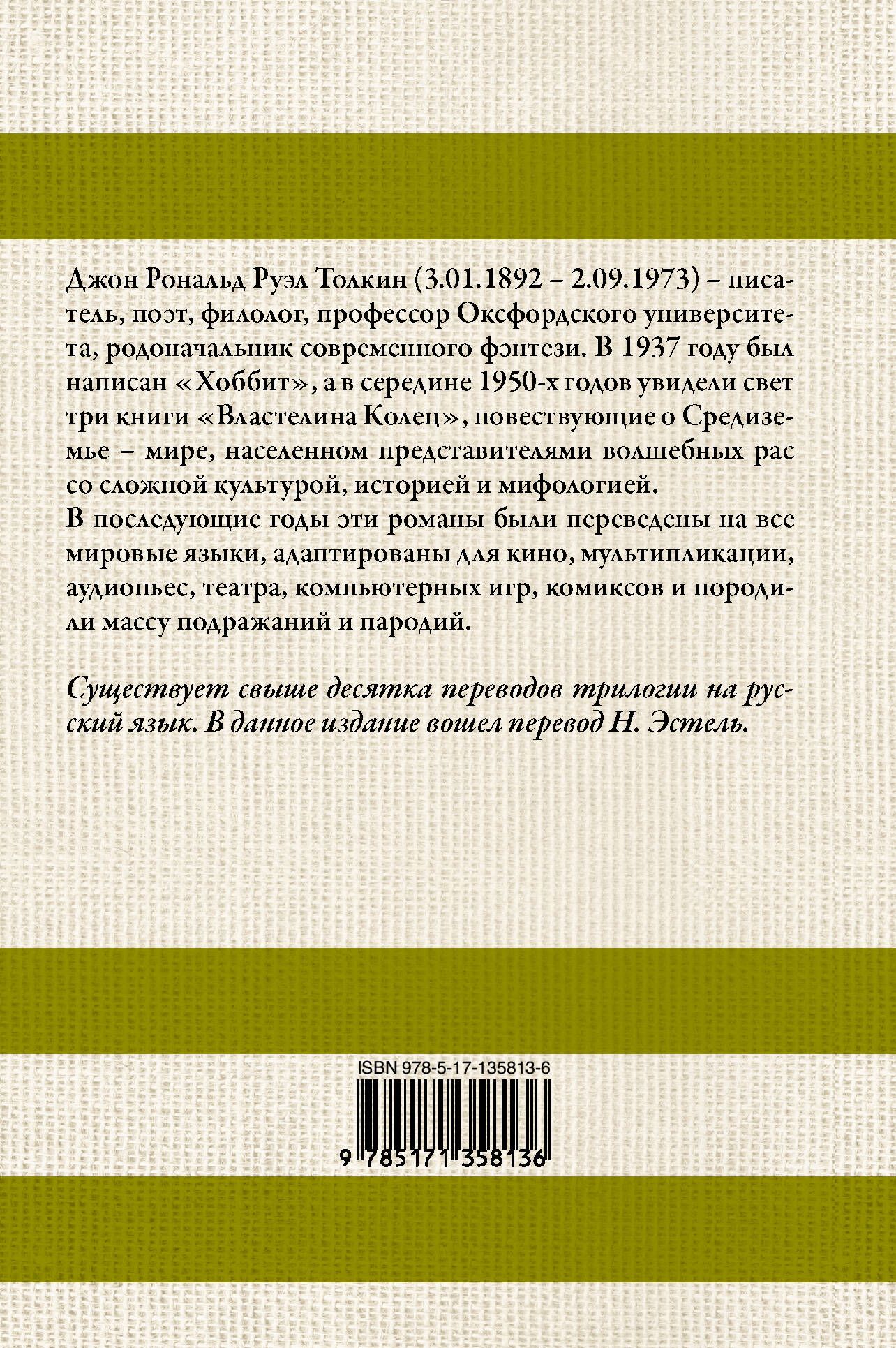 Джон Рональд Руэл Толкин (3.01.1892 – 2.09.1973) – писатель, поэт, филолог, профессор Оксфордского университета, родоначальник современной фэнтези. В 1937 году был написан "Хоббит", а в середине 1950-х годов увидели свет три книги "Властелина колец", повествующие о Средиземье – мире, населенном представителями волшебных рас со сложной культурой, историей и мифологией. Существует свыше десятка переводов трилогии на русский язык. В данное издание вошел перевод Н. Эстель.